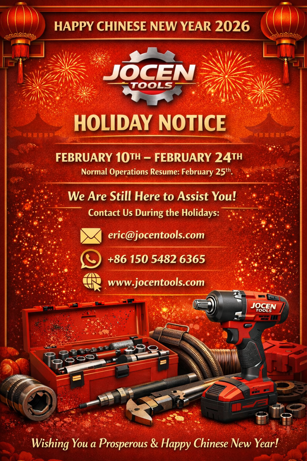 Thank you for your continued trust and support of JOCEN TOOLS. As the Chinese New Year is approaching, we would like to inform you of our holiday schedule and service arrangements during this period.