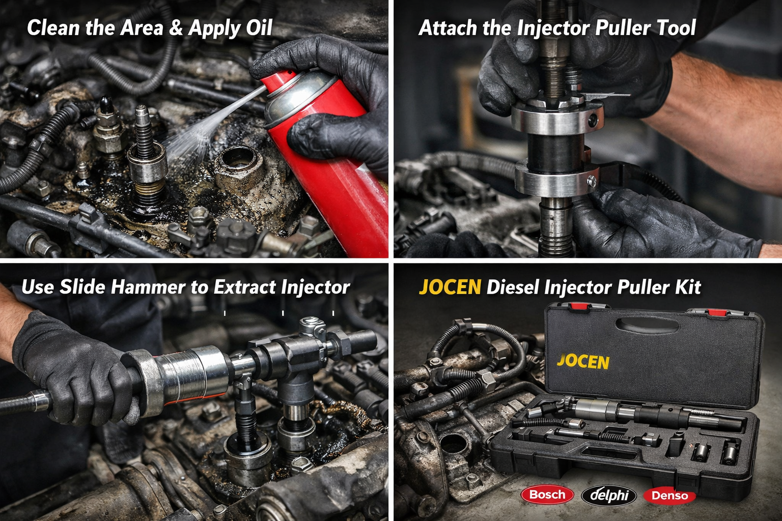 Our injector puller kits are designed for engines equipped with Bosch, Delphi, and Denso injectors.